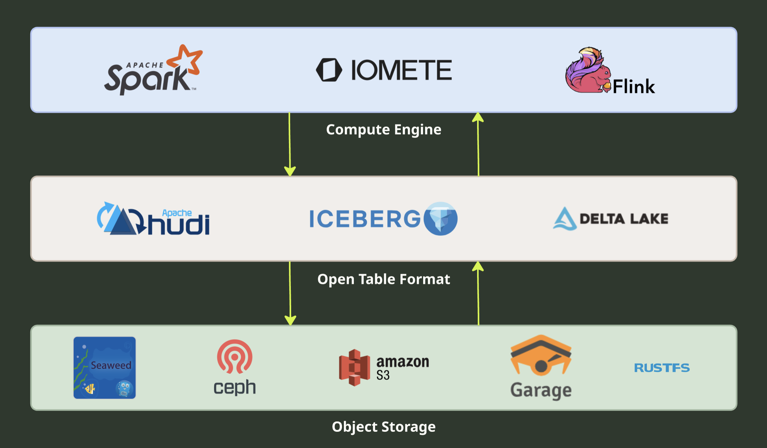 In a lakehouse, open table formats like Apache Iceberg sit between compute engines and the storage layer. Iceberg handles the hard parts (ACID transactions, schema evolution, time travel, partition pruning) by maintaining metadata that points to data files in object storage. Compute engines like Spark, Flink, and Trino — or lakehouse platforms like IOMETE — read that metadata, then go directly to the object store for the actual data.