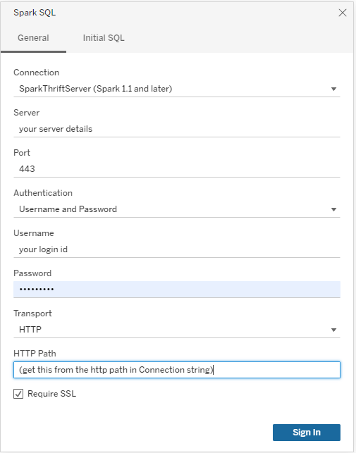 - Fill in the Spark SQL connection dialog with these parameters: