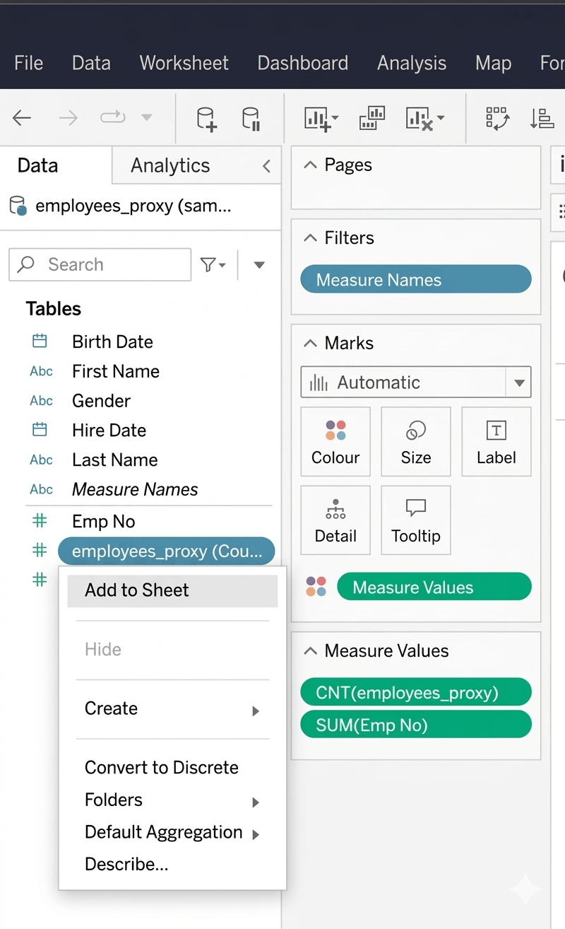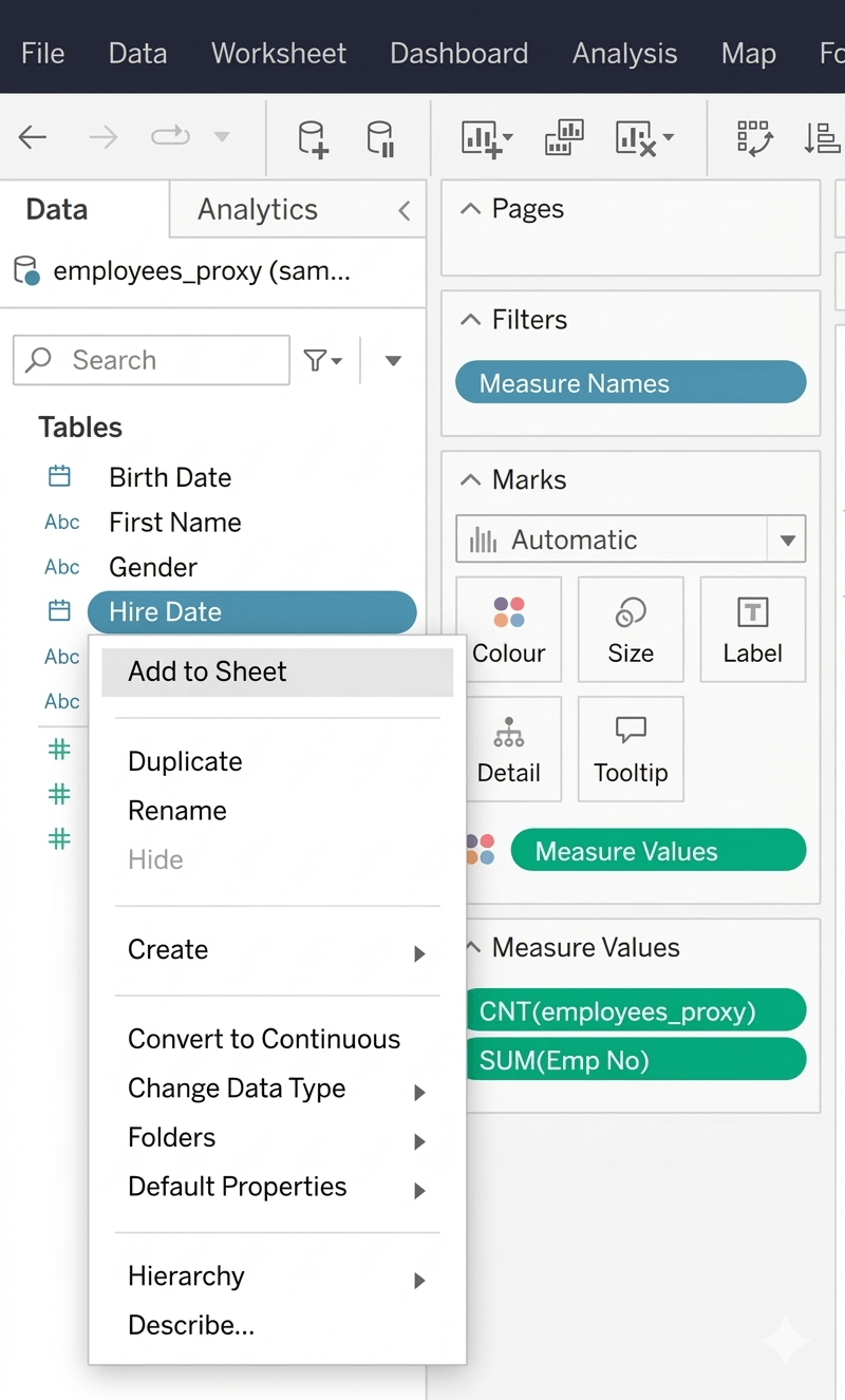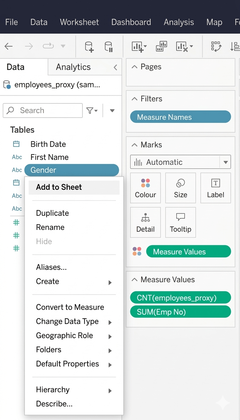 - Right-click a dimension or measure and select Add to Sheet.