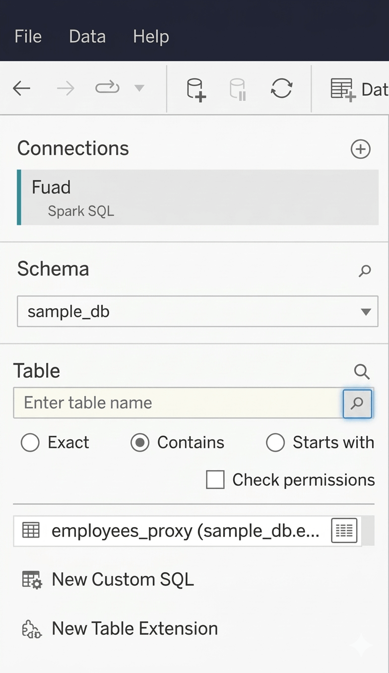 This is the simplest path because Tableau ships with a built-in Spark SQL connector. Nothing extra to install.