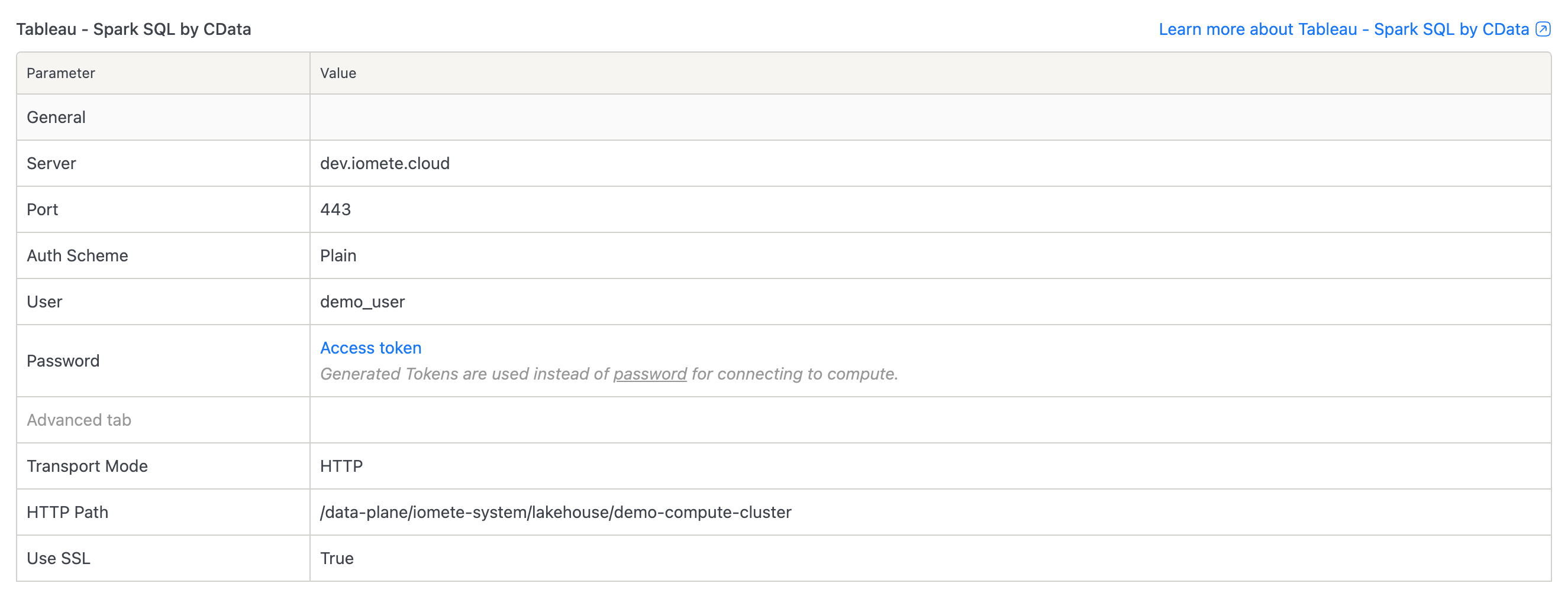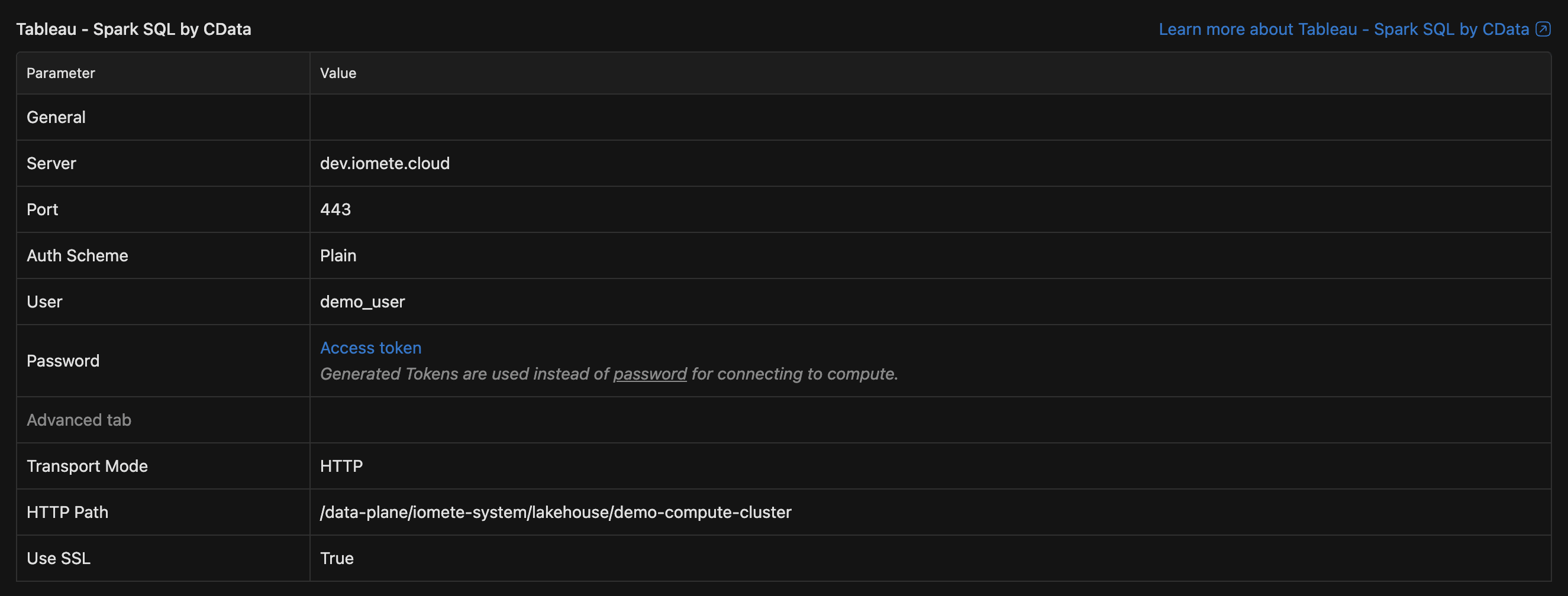- Spark SQL driver: Tableau's built-in Spark SQL connector (recommended)
