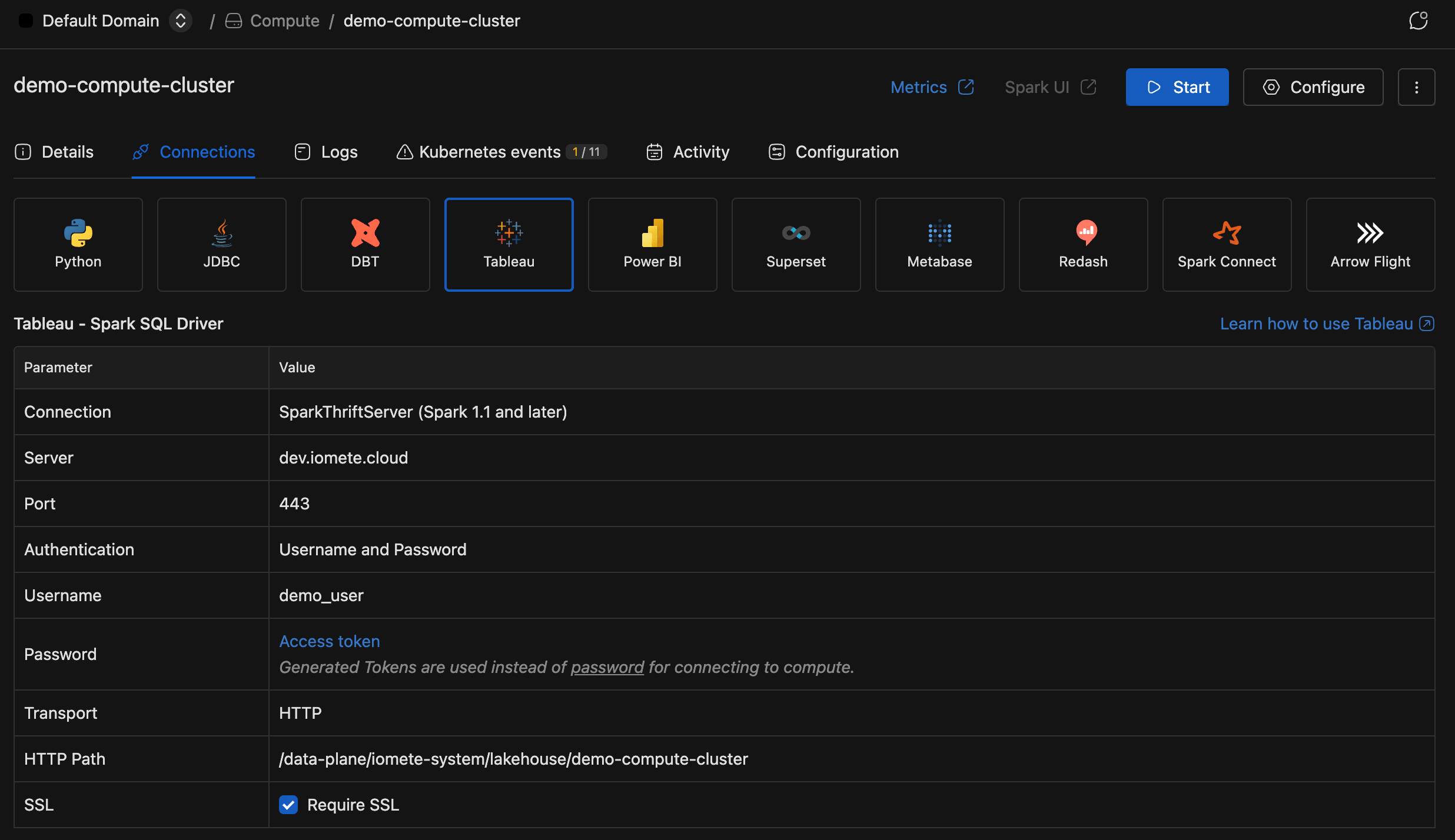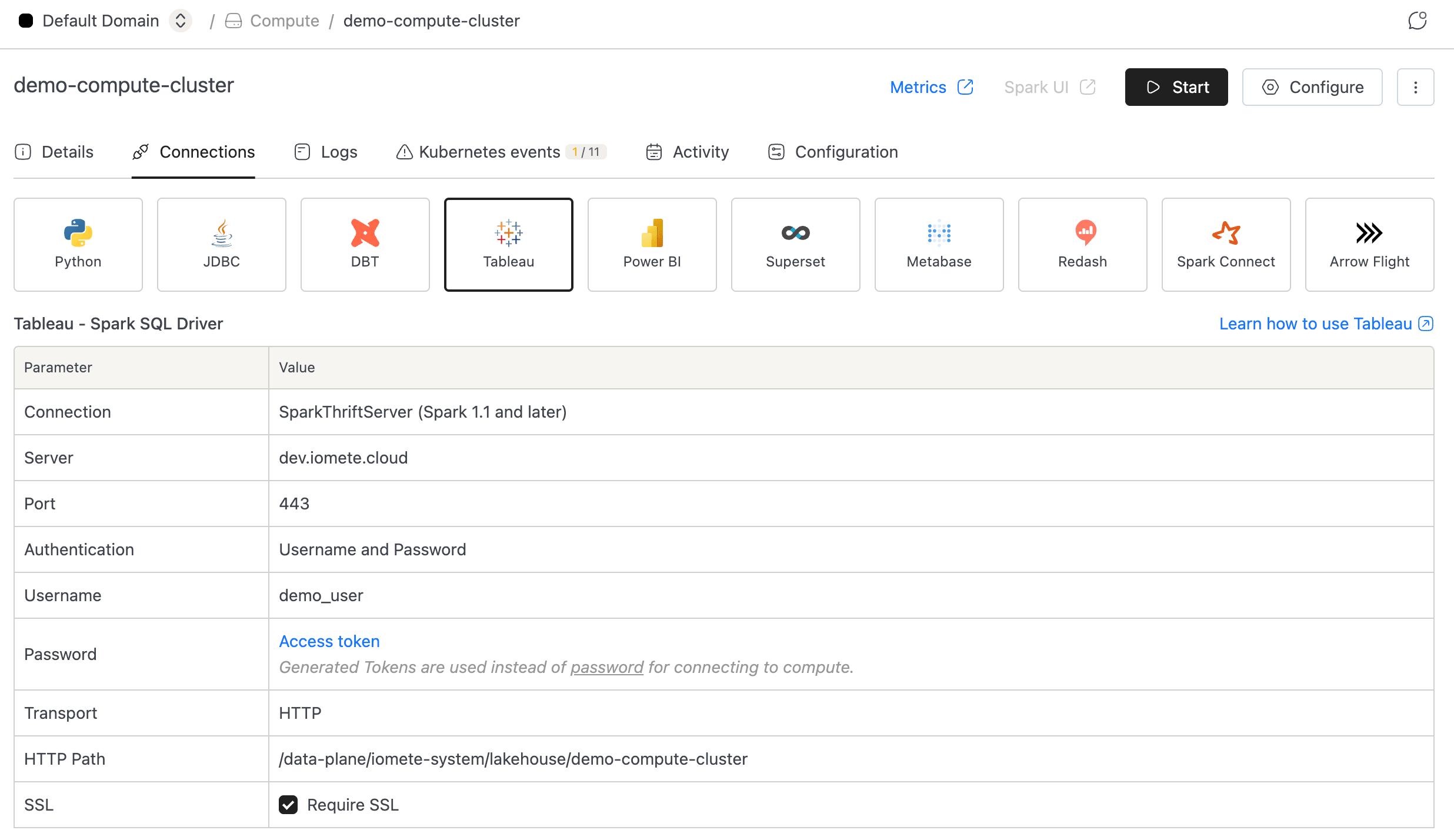 You don't need to assemble connection strings by hand. IOMETE generates them for each compute cluster.