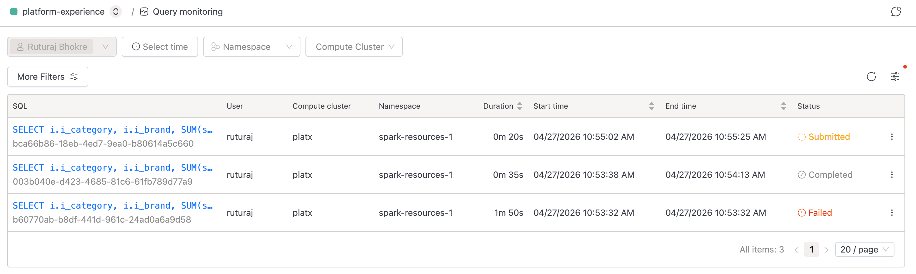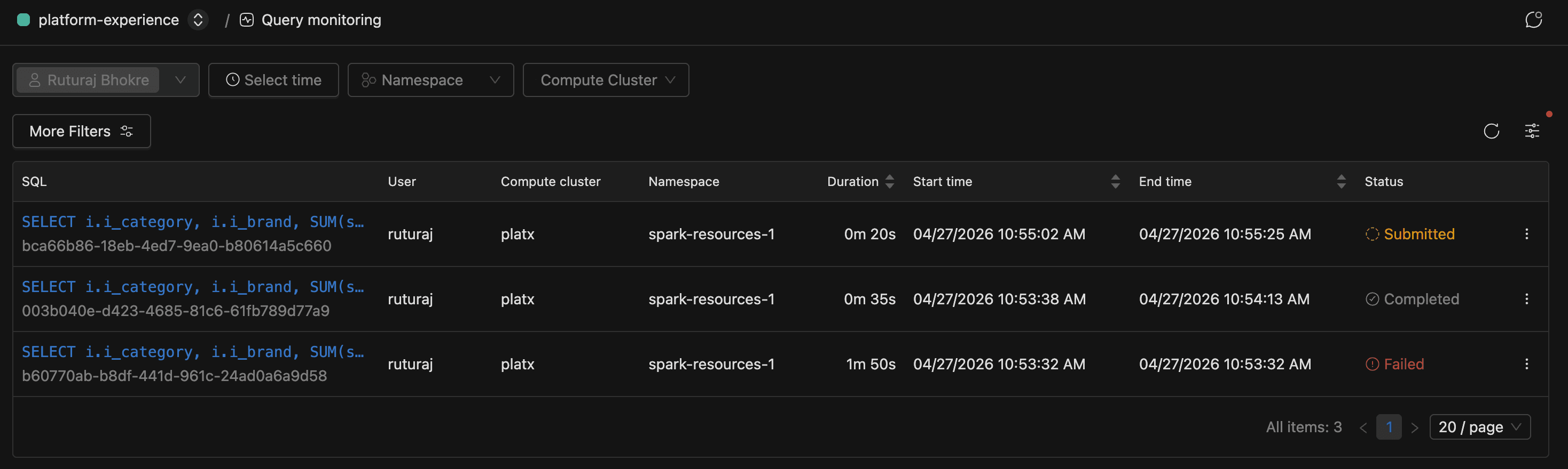 Each record captures the SQL text and who ran it, the compute cluster and namespace it landed on, timing and resource metrics, and the final status.