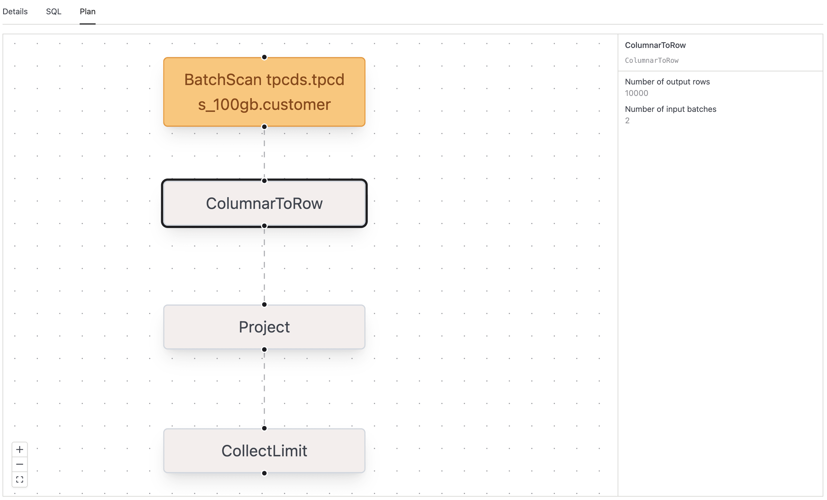 - The graph renders with one node per Spark plan operator. Pan by click-and-drag, zoom with the scroll wheel, or use the zoom and fit-view buttons in the lower-left corner.
