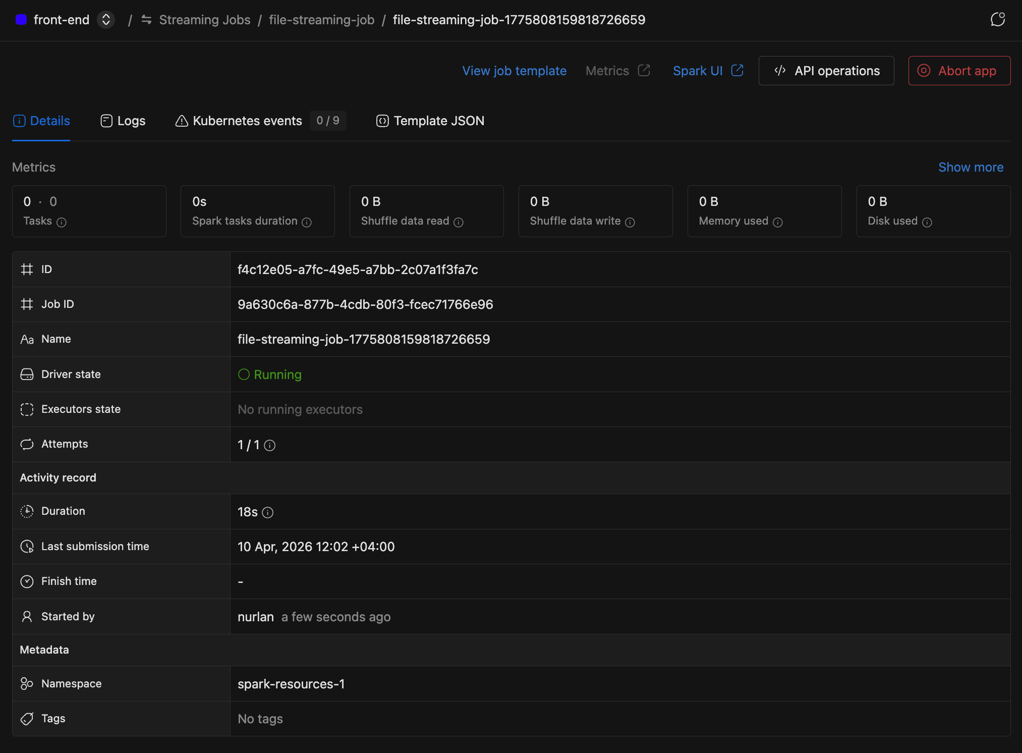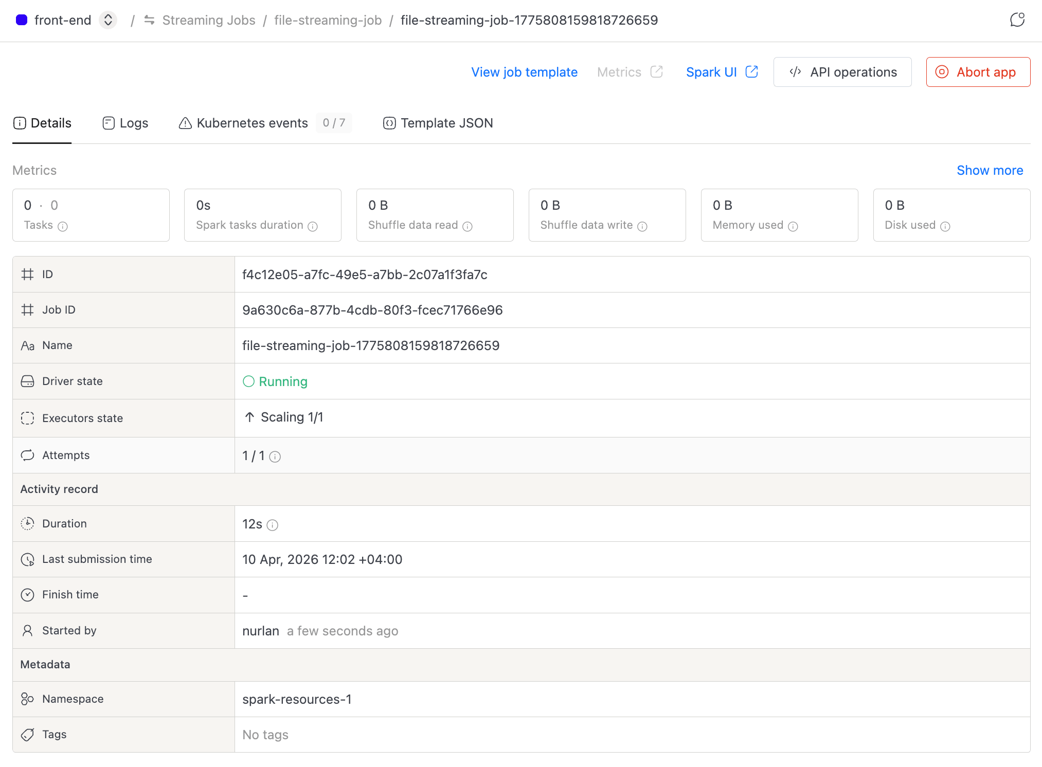 Streaming Jobs are long-running Spark applications built for continuous data processing: real-time ingestion, event processing, and anything that needs always-on execution. Unlike regular Spark Jobs, which run on a schedule or on demand, Streaming Jobs run indefinitely until you stop them.