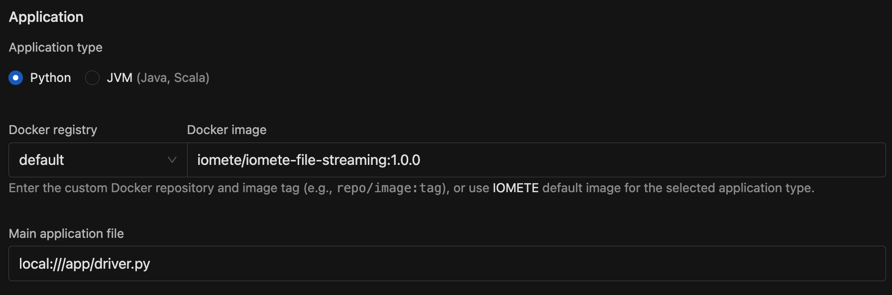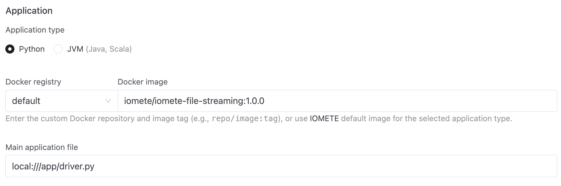 defaultfor IOMETE's built-in registry, or choose a private Docker registry), then enter the image and tag. - Main class (JVM only): The fully qualified class name, e.g.