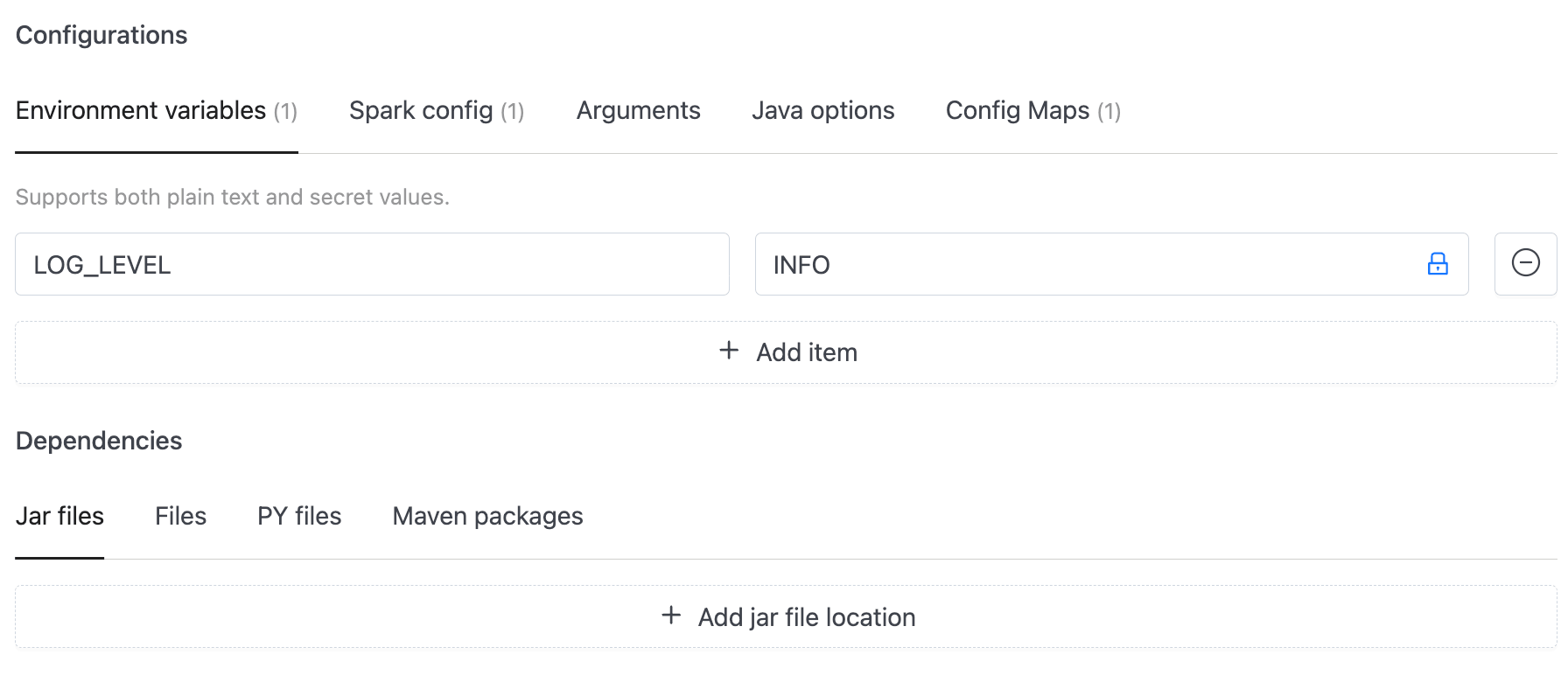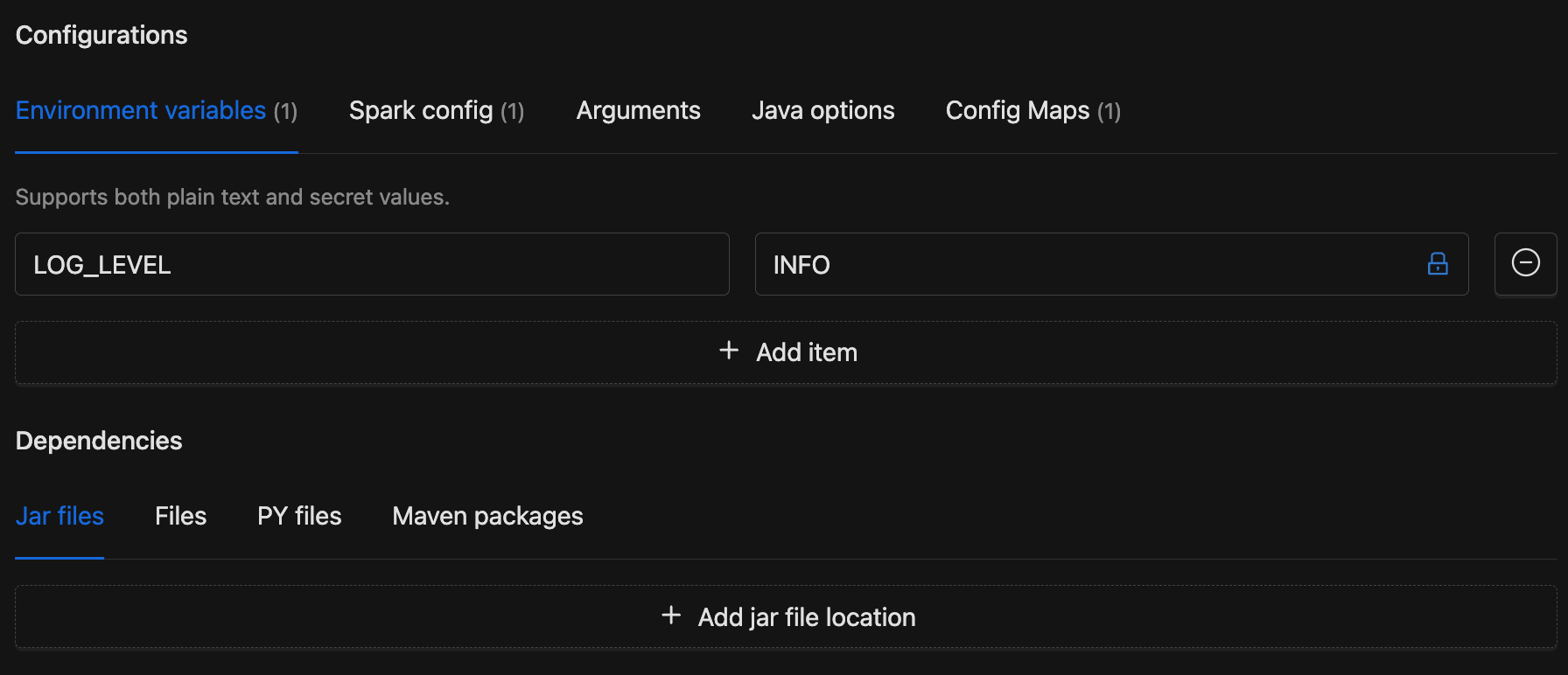 - Configurations: Tabs for environment variables, environment secrets, Spark config key-value pairs, Spark config secrets, application arguments, Java options, and config maps. See Configurations for details.