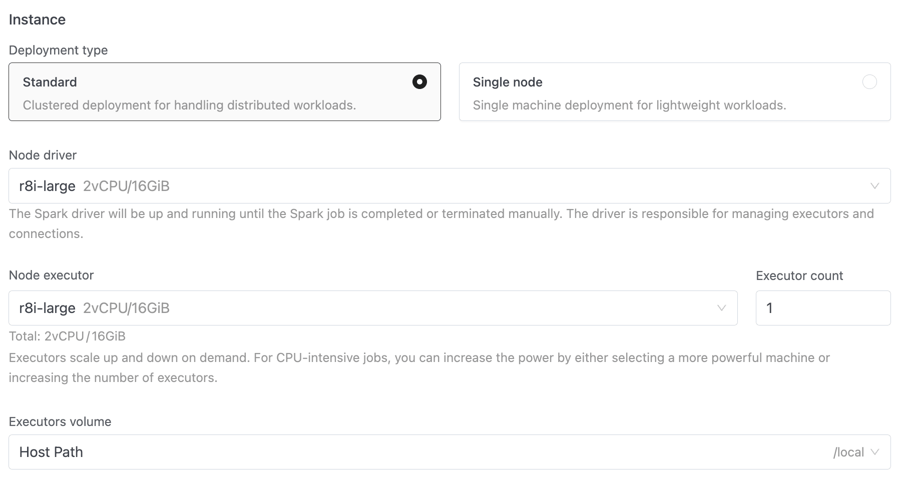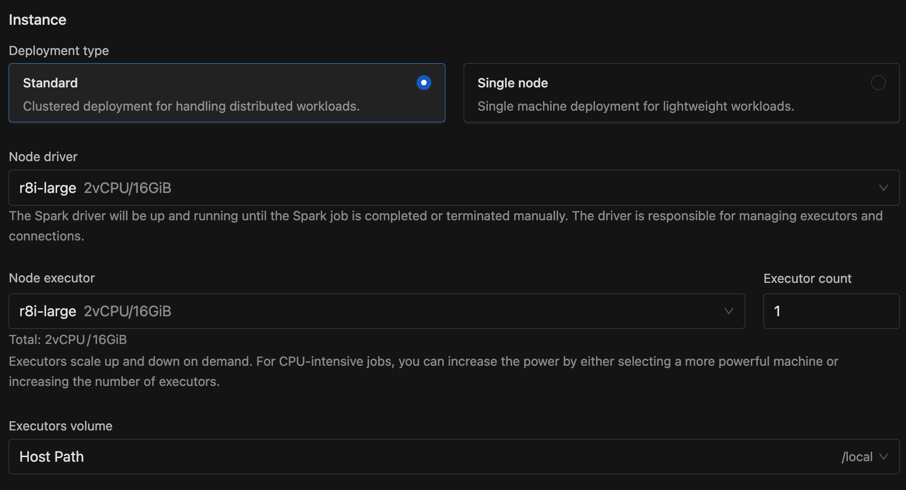 - Deployment type: Standard (clustered, with separate driver and executors) or Single node (lightweight, single machine).