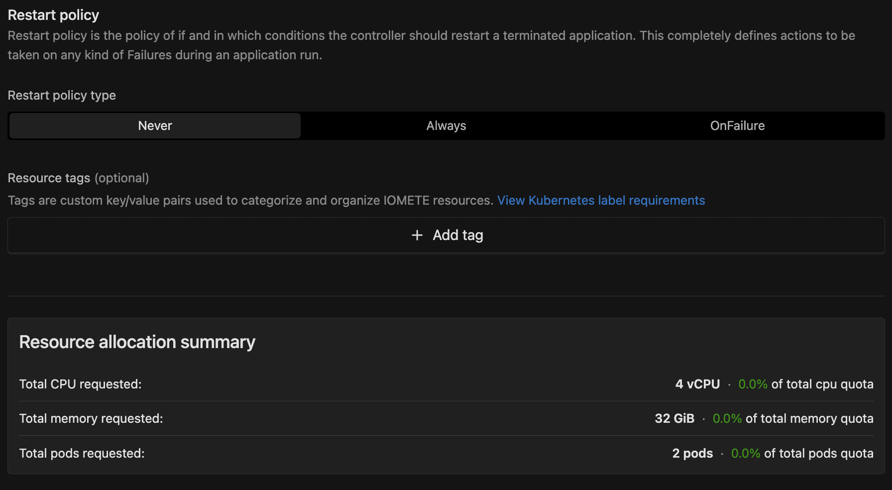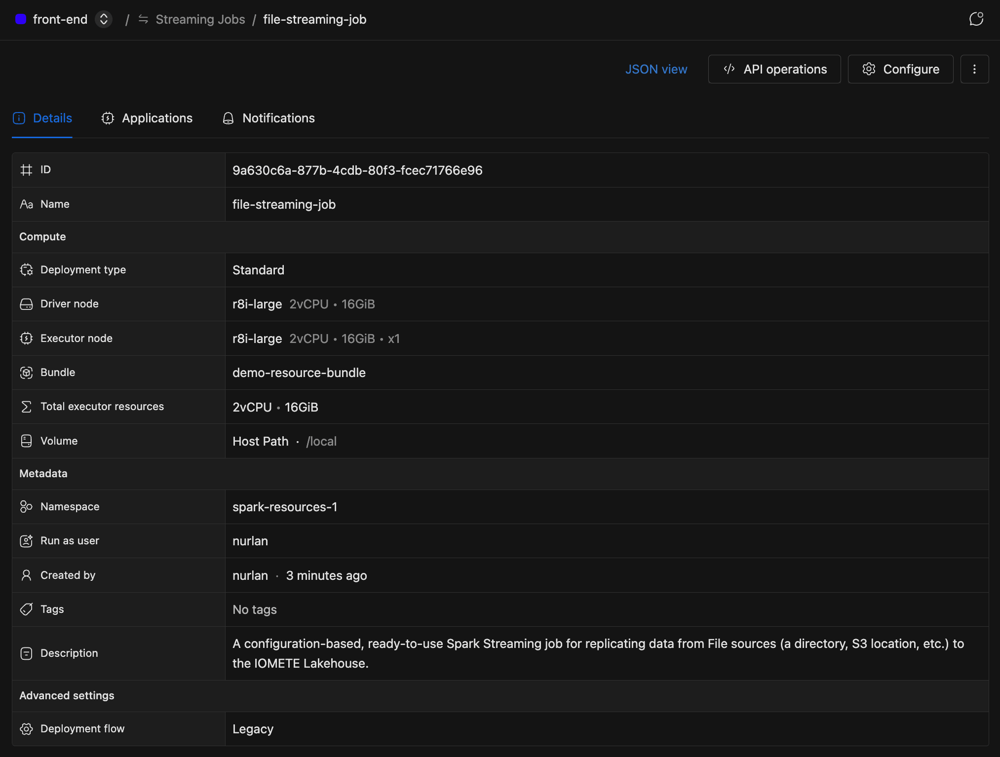 - Compute: deployment type, driver node, executor node, bundle, total executor resources, and volume.