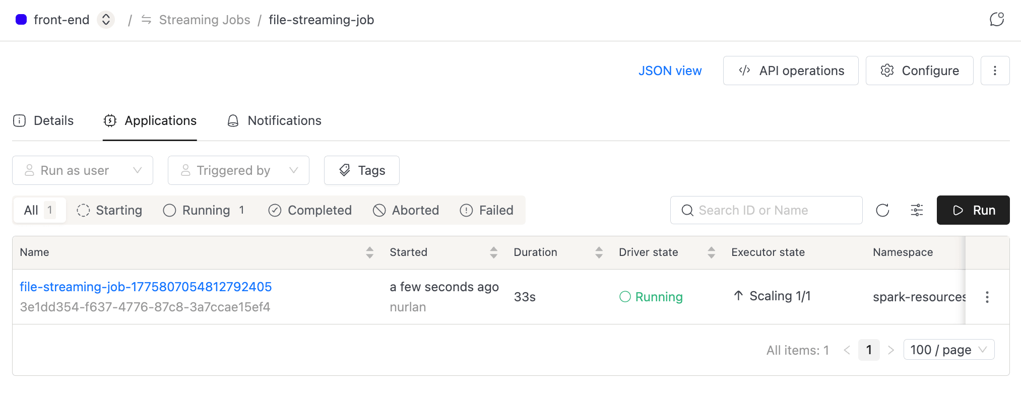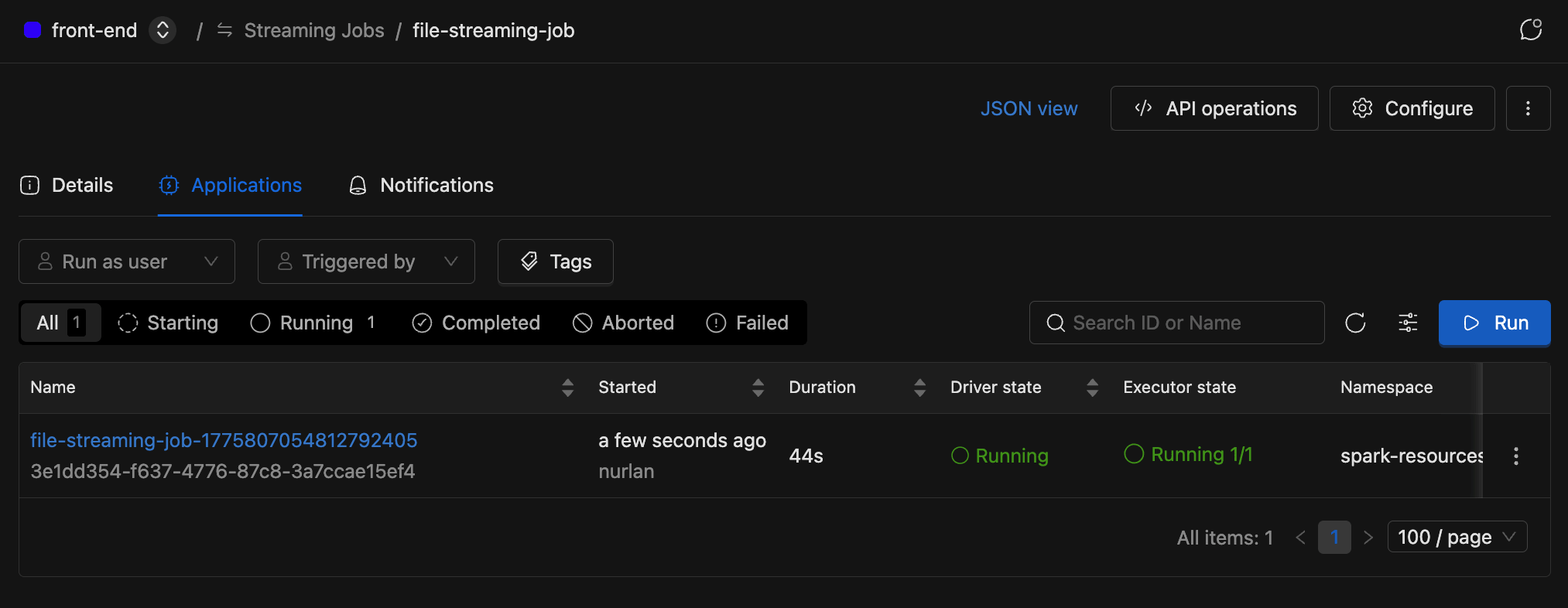 Once a streaming job is configured, you can launch it with a single click. Open the job's detail page, switch to the Applications tab, and click Run.