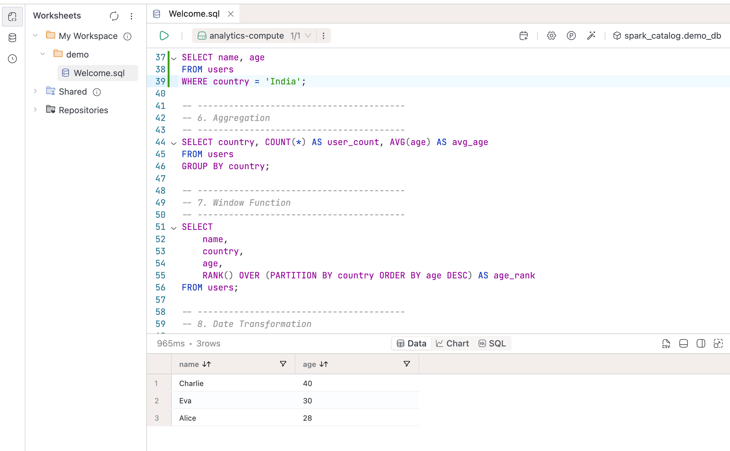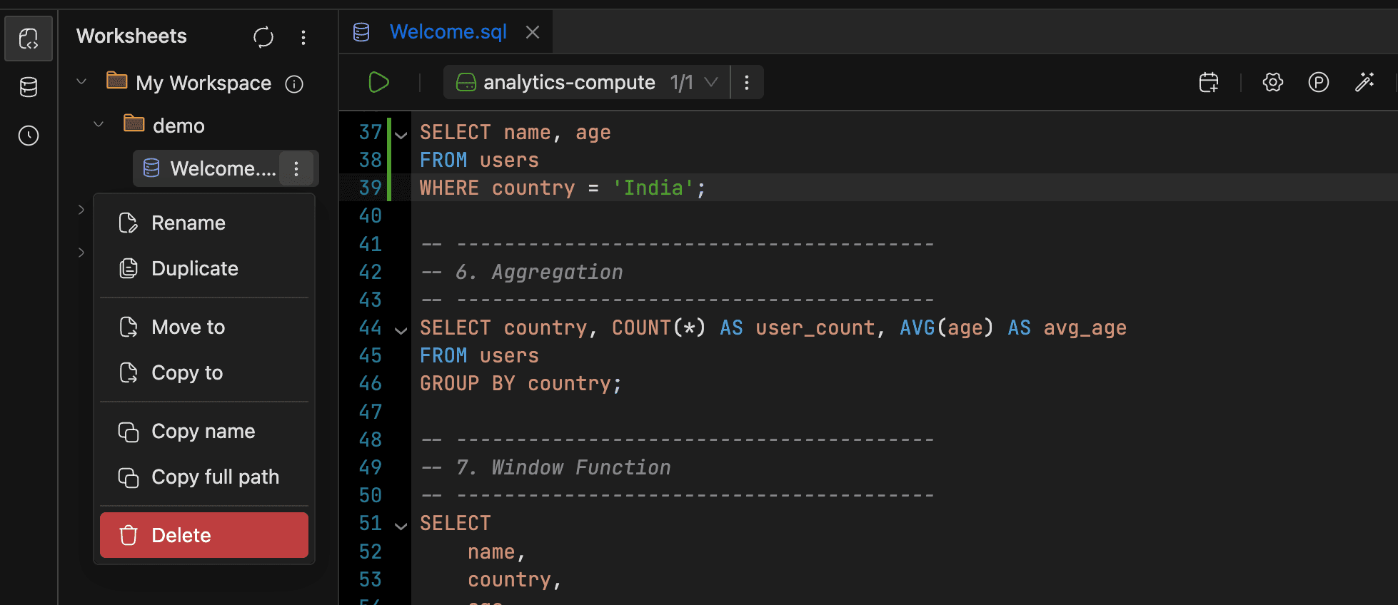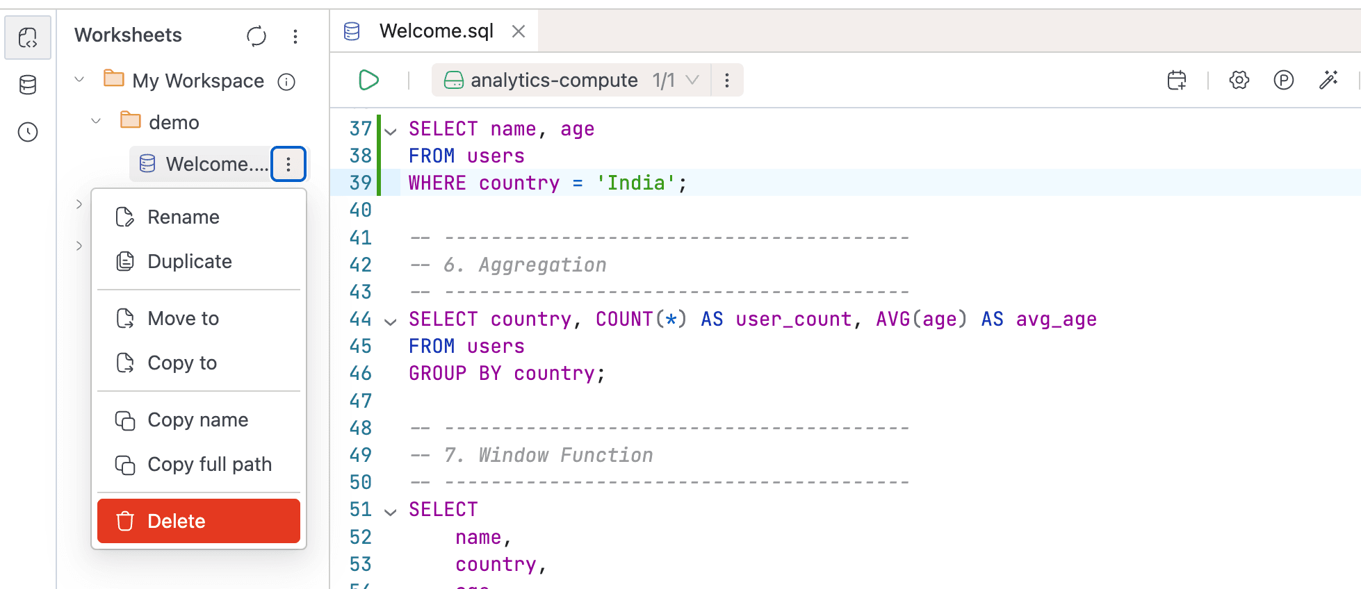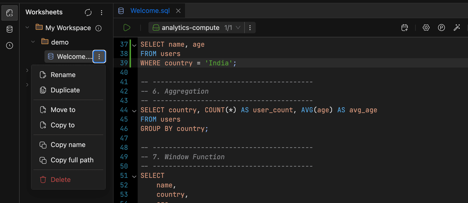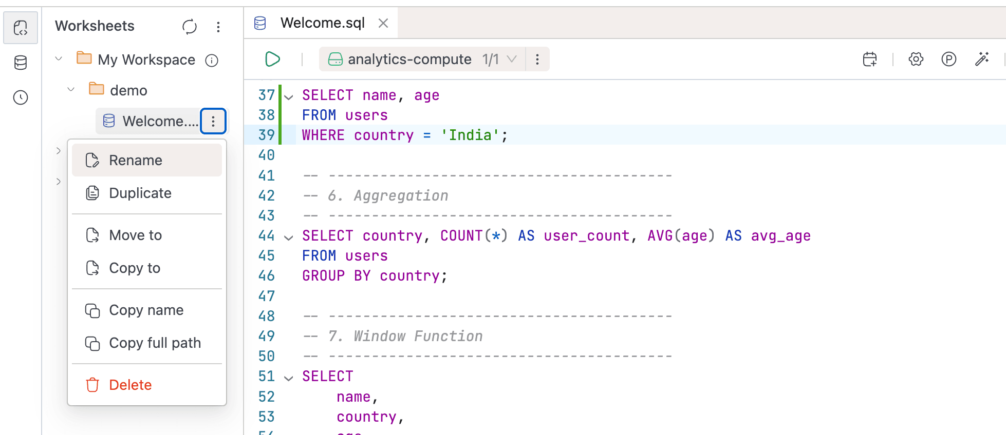 You organize worksheets in a three-level hierarchy (Workspaces > Folders > Worksheets), structured however fits your team. Beyond basic query editing, worksheets support: