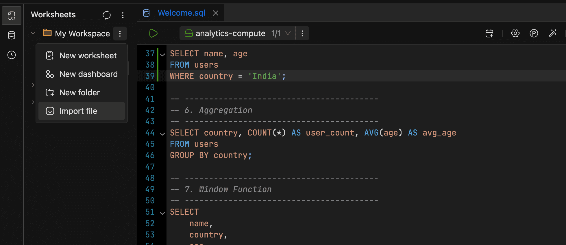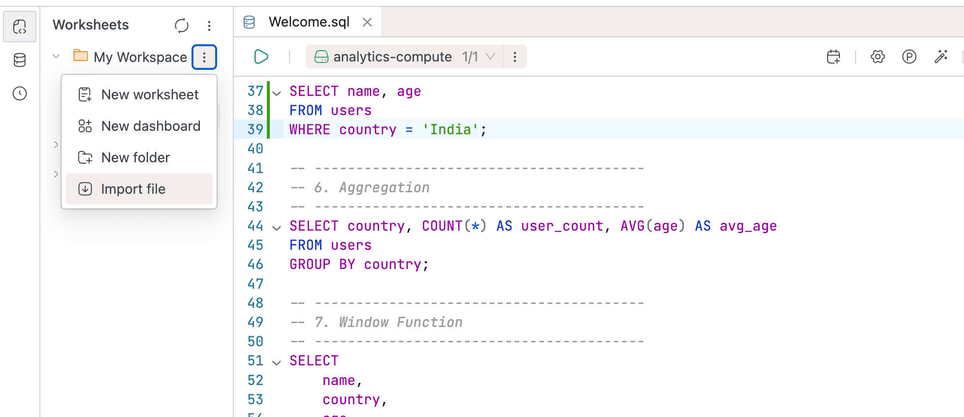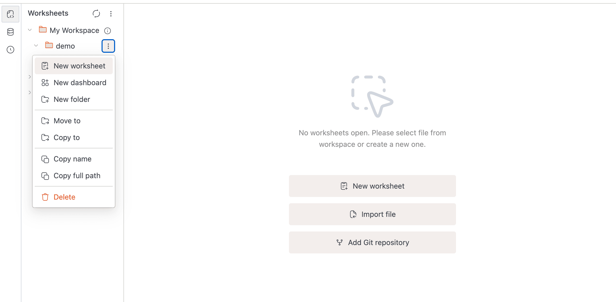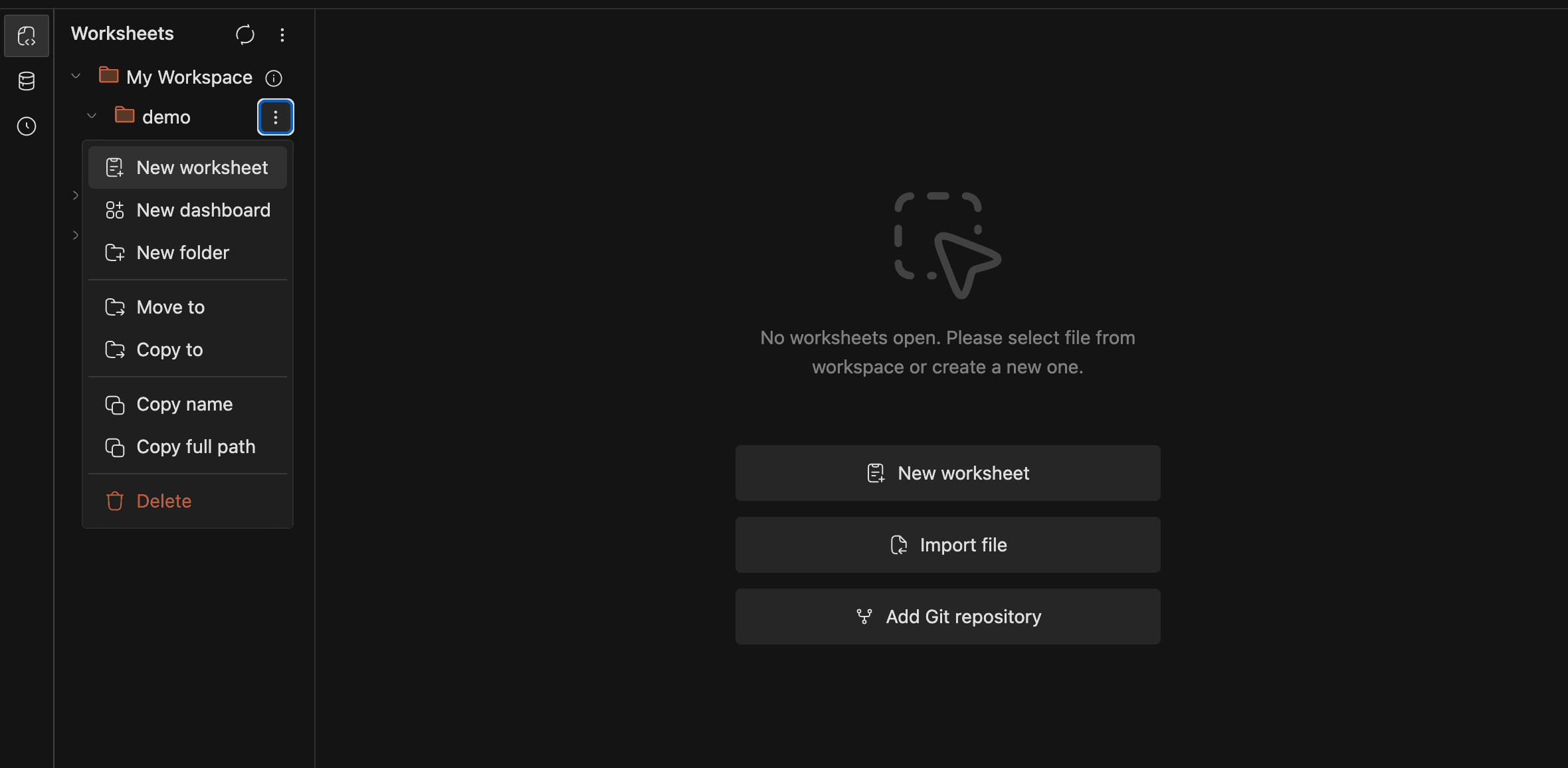 If you have existing .sql, .dash, or .ipynb files, you can import them as worksheets. Right-click a workspace node and select Import file, or use the Import file button on the home screen. The new worksheet takes the file's name and content. Home-screen imports land in My Workspace.