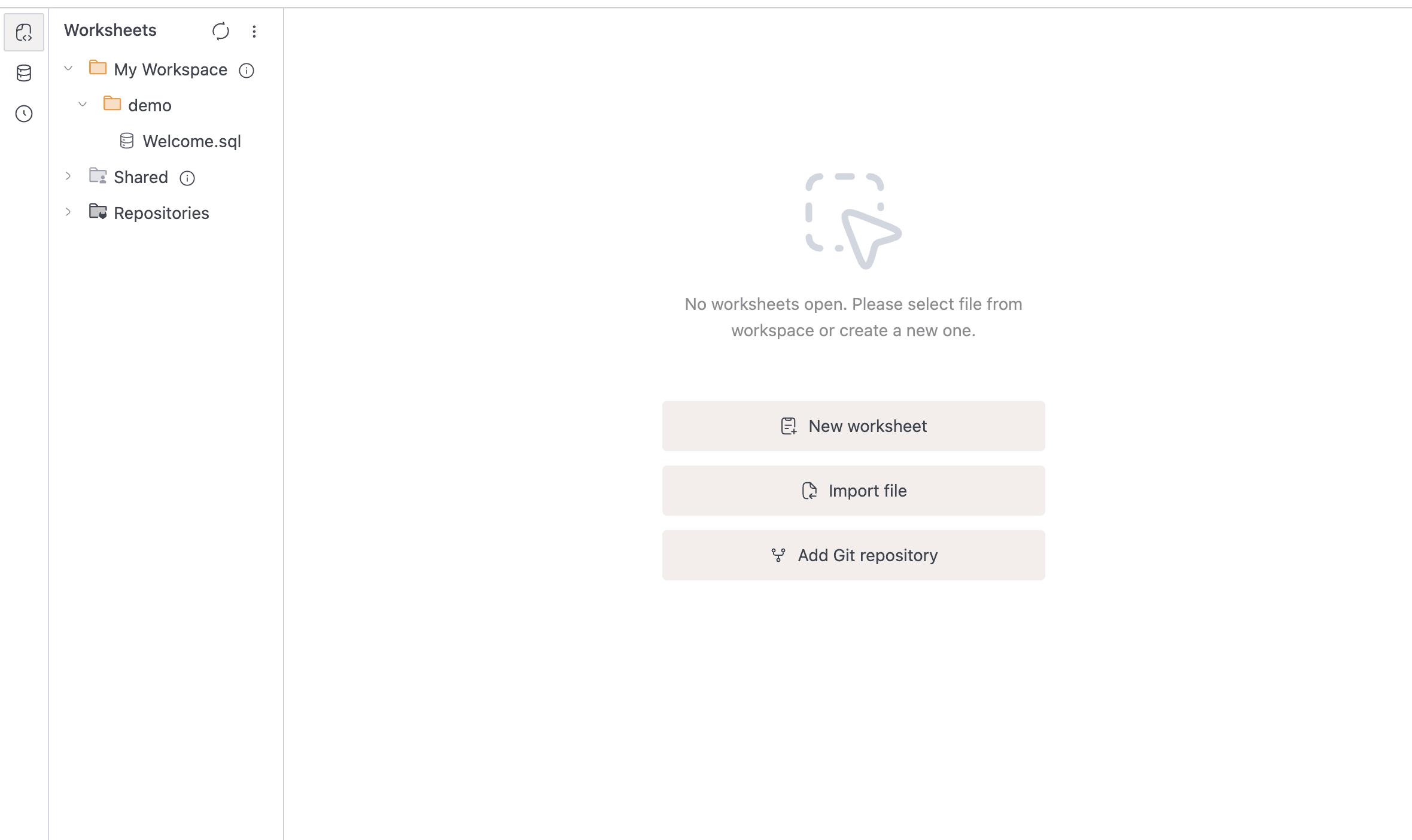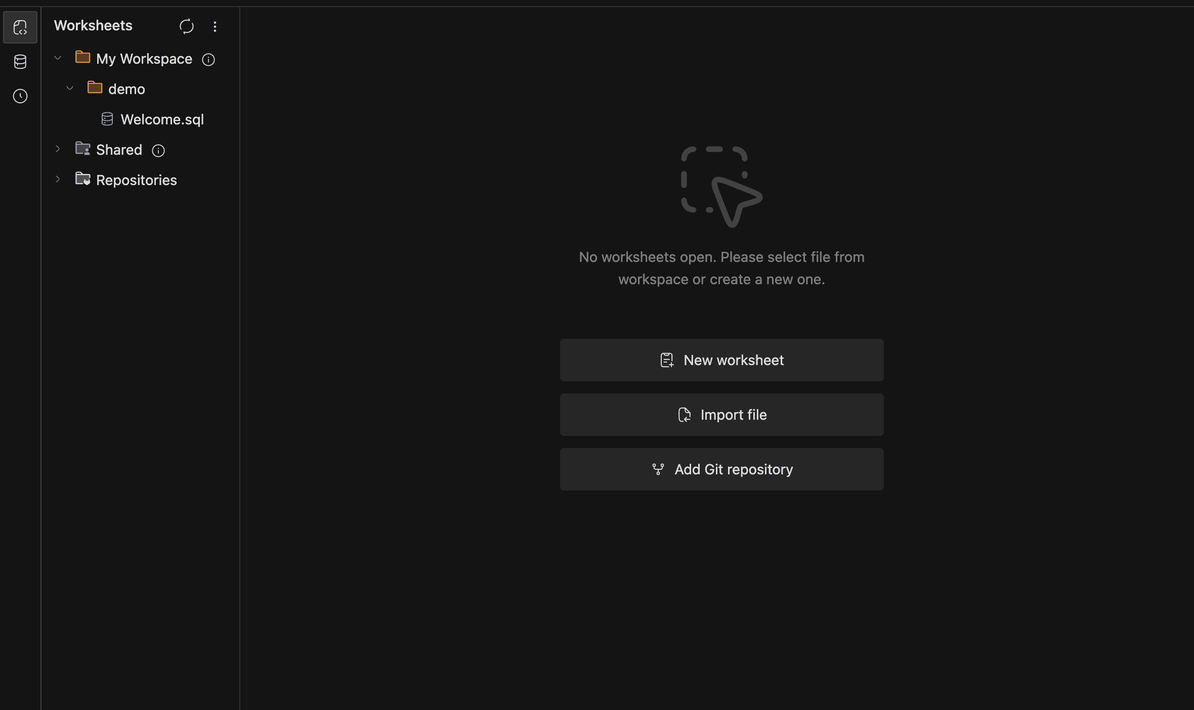 The home screen gets you from zero to a working worksheet in one click. When you first open the SQL Editor with no worksheets, you'll see three options: