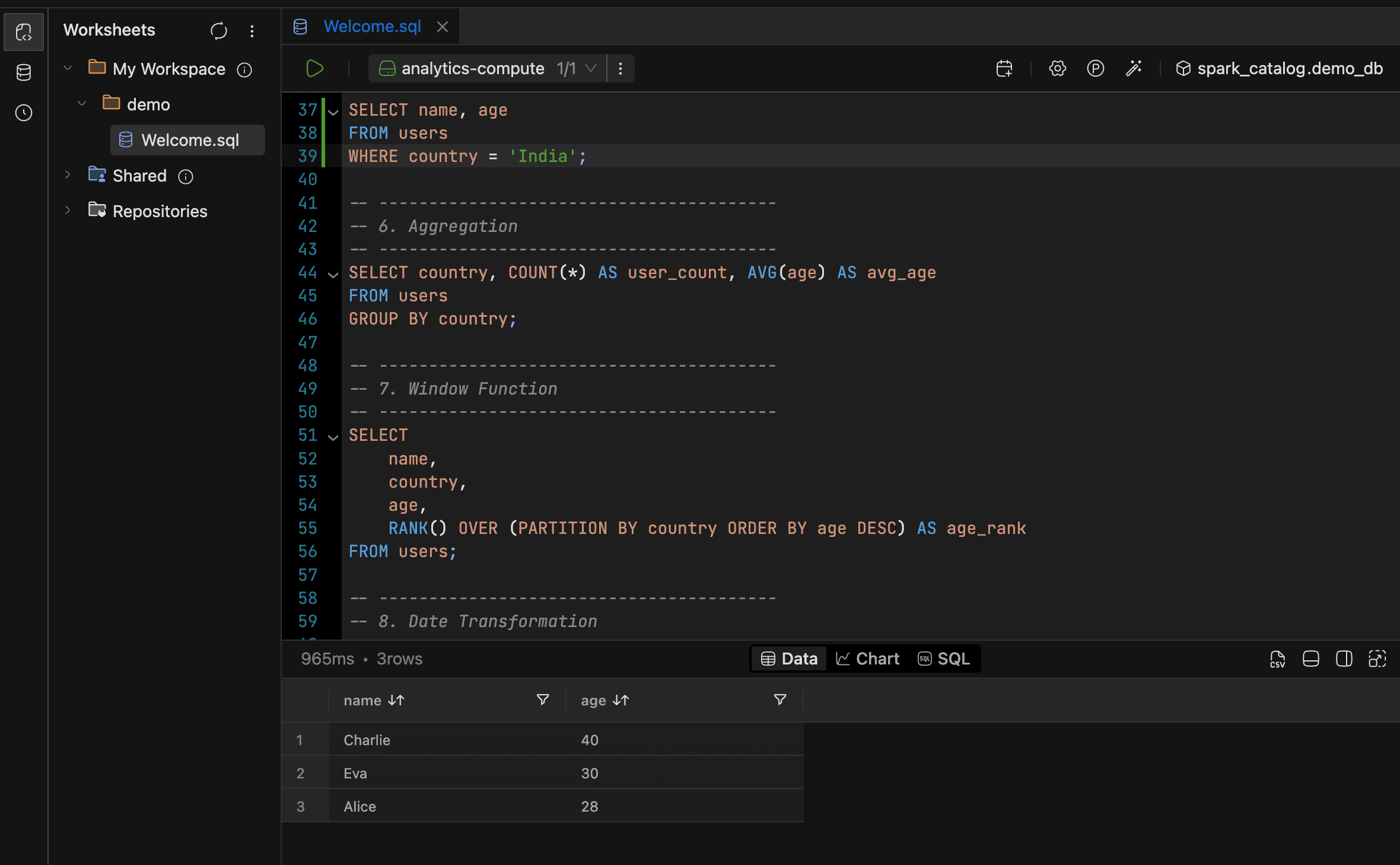 If you spend most of your day writing and iterating on SQL, worksheets are where that happens. Each worksheet holds a query plus its full context: compute cluster, catalog, database namespace, and any query variables. That context persists between sessions, so you pick up right where you left off.
