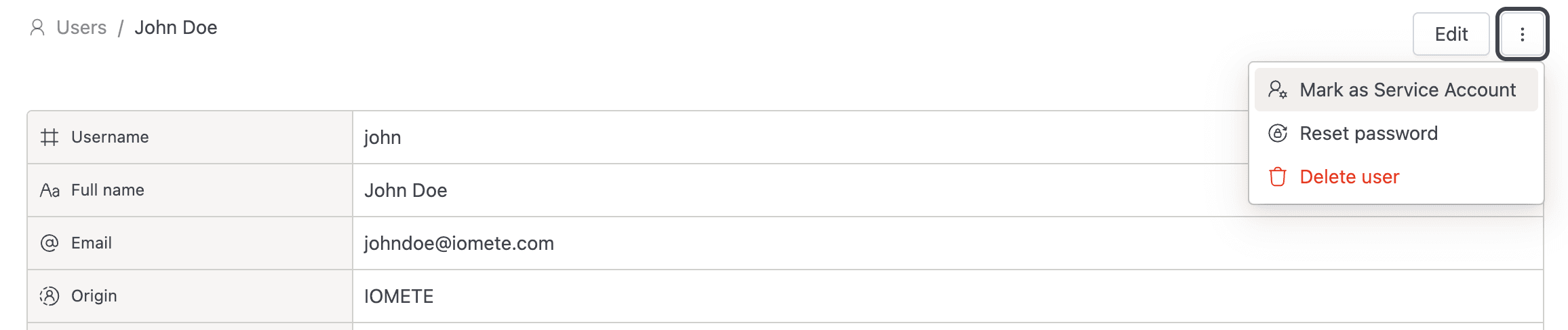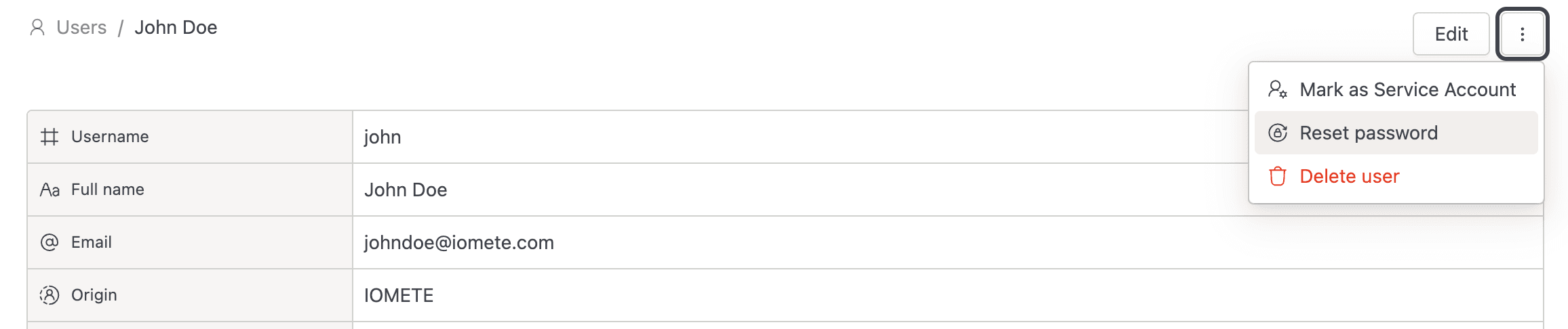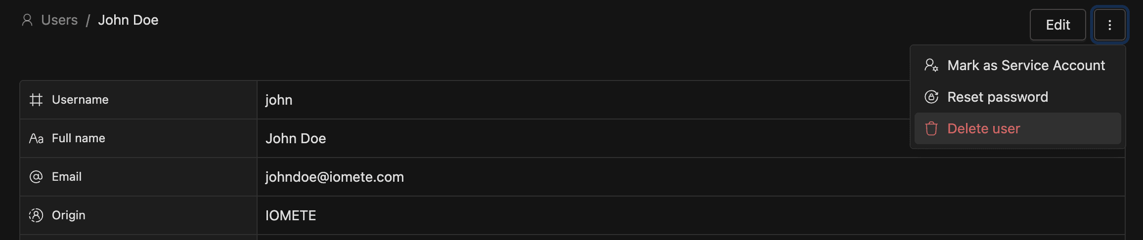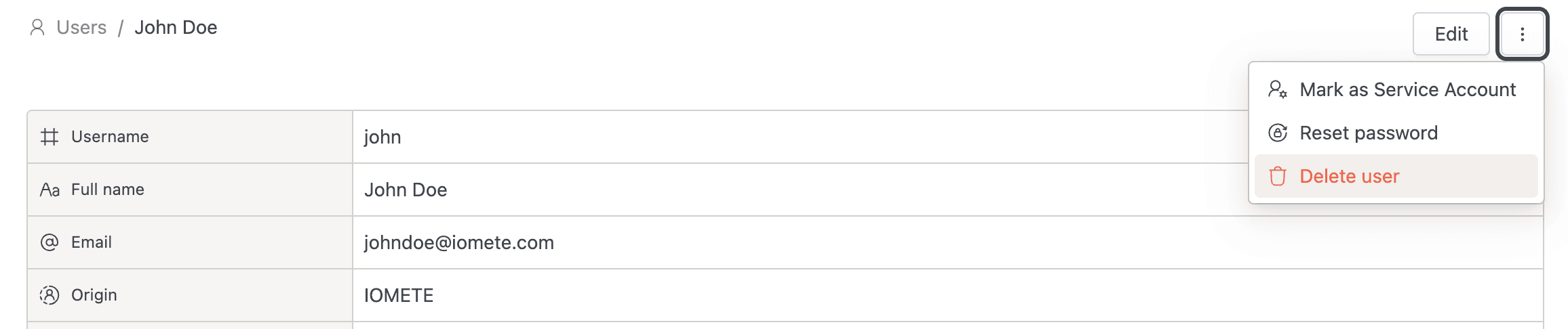 From the detail page: open the Actions dropdown, click Delete user, then confirm. IOMETE redirects you back to the user list.