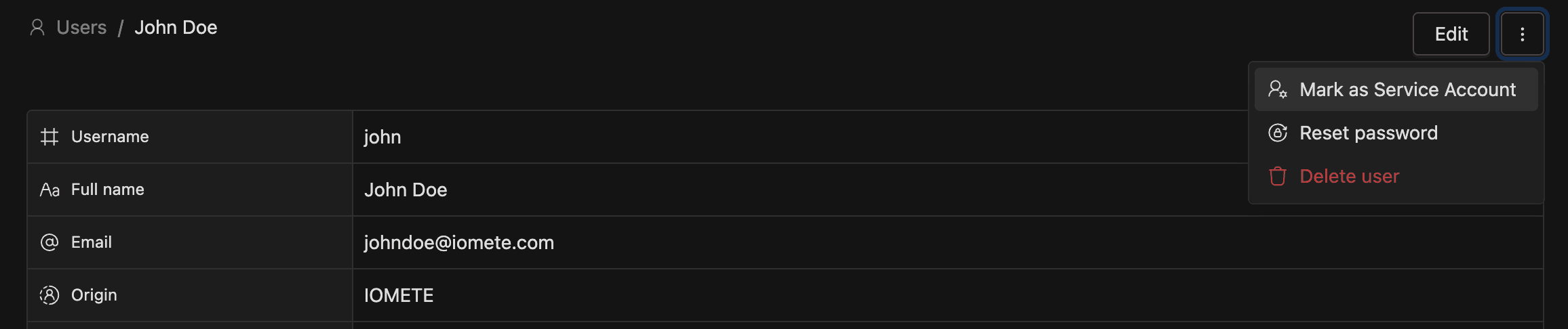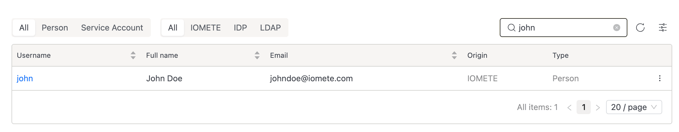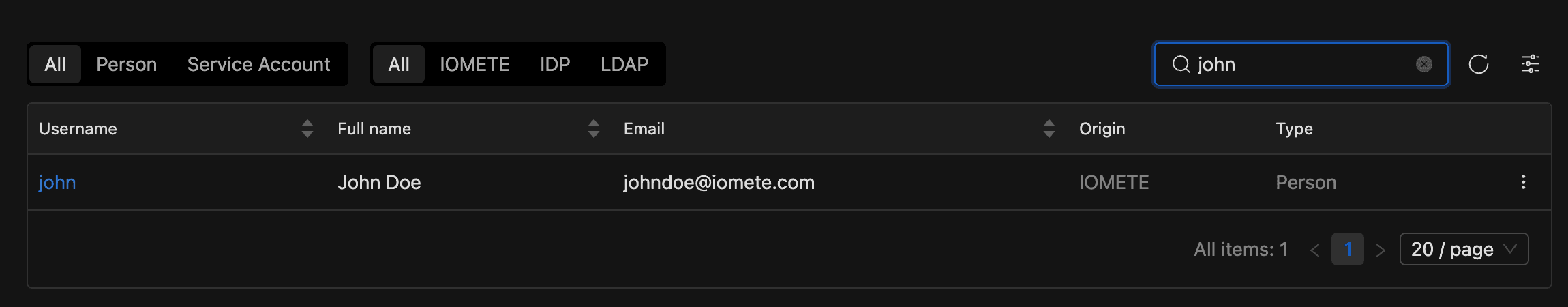 | Origin | How the account was created: IOMETE, LDAP, or IDP |