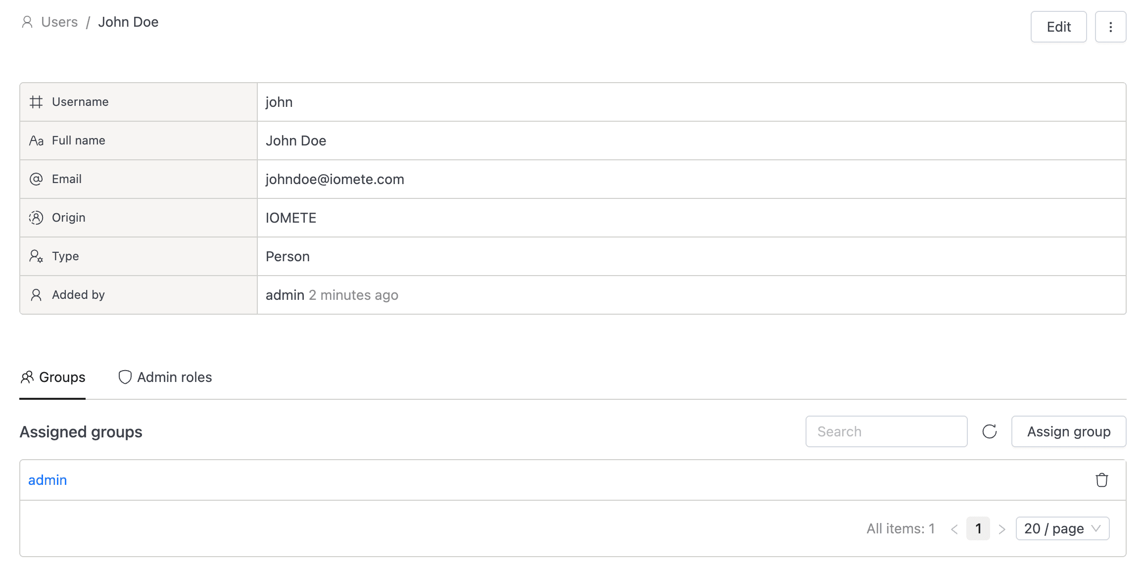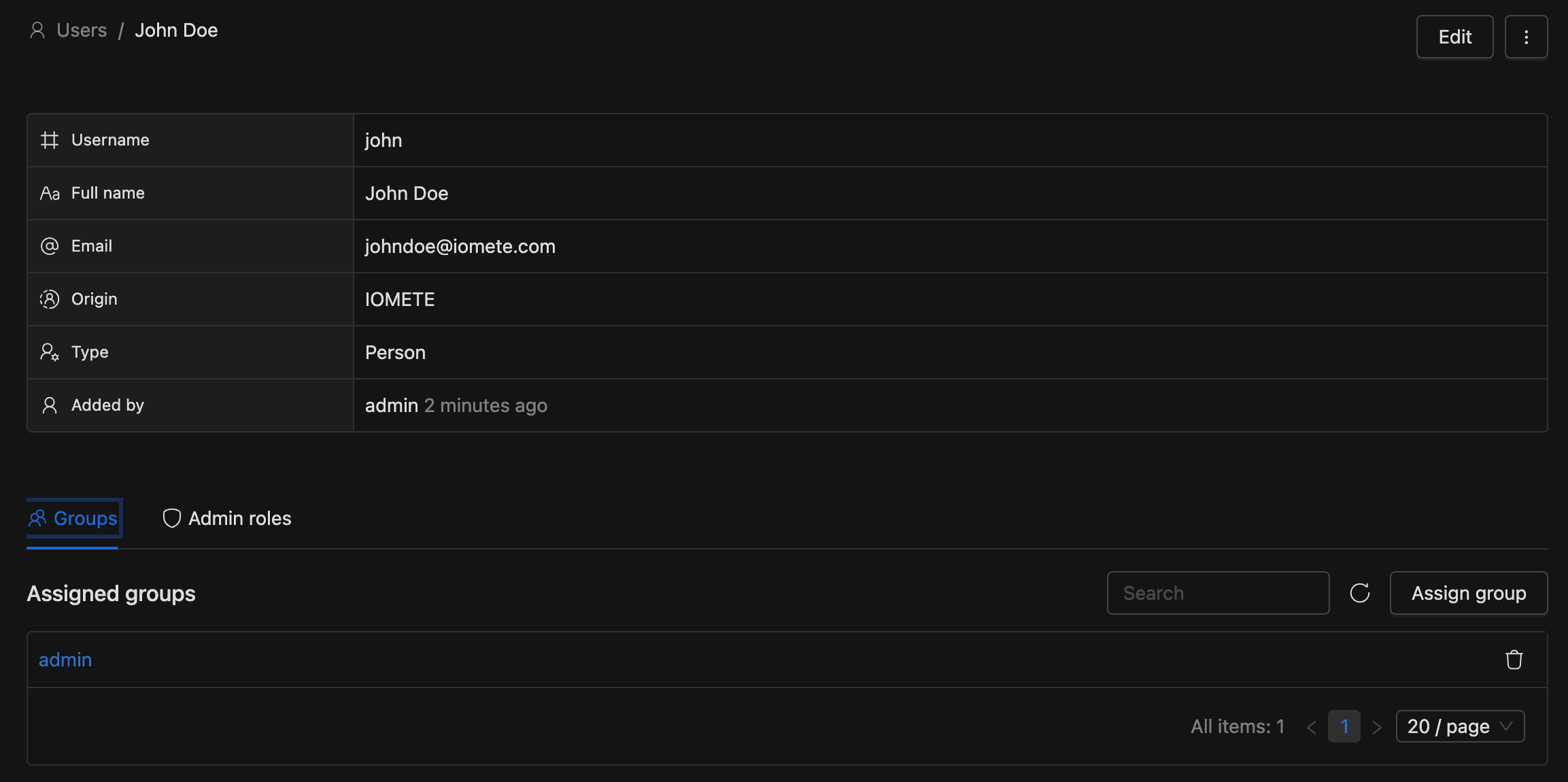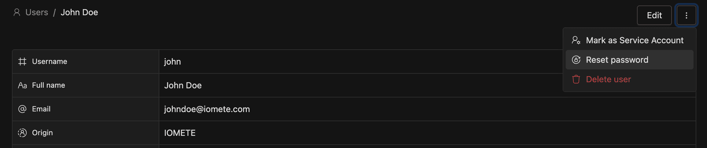 | Origin | How the account was created: IOMETE, LDAP, or IDP |