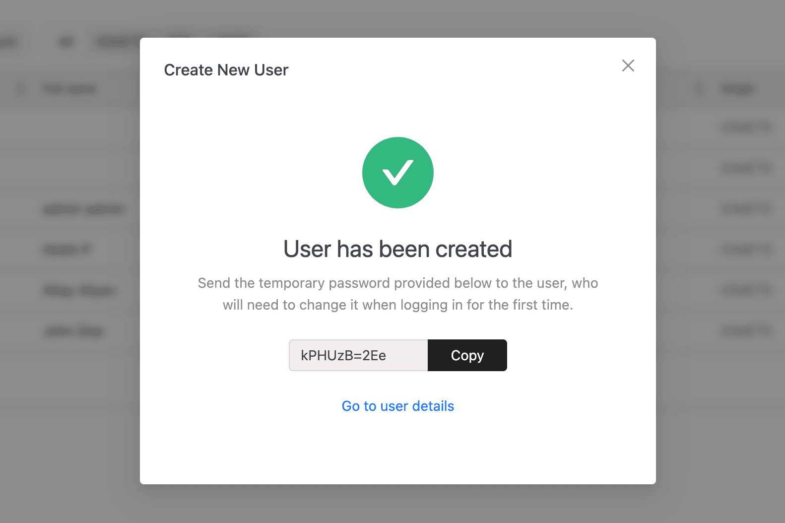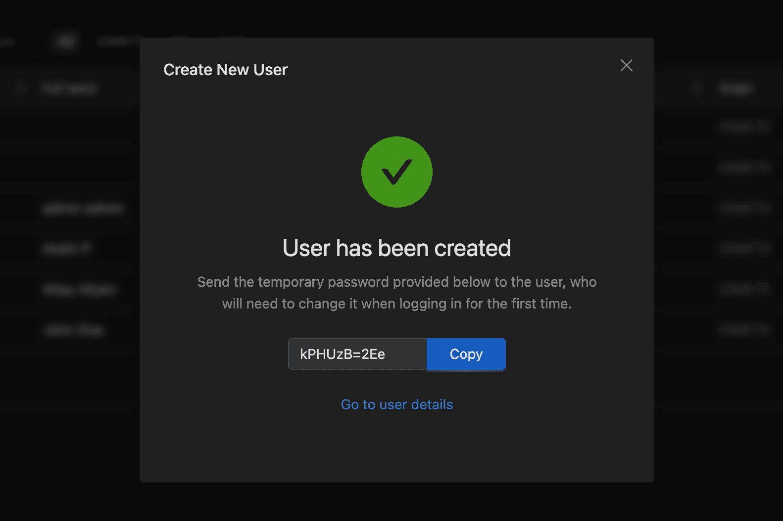 If creation succeeds, the drawer displays a confirmation screen with a temporary password and a Copy button. Share this password with the user because they'll need to change it on first login.