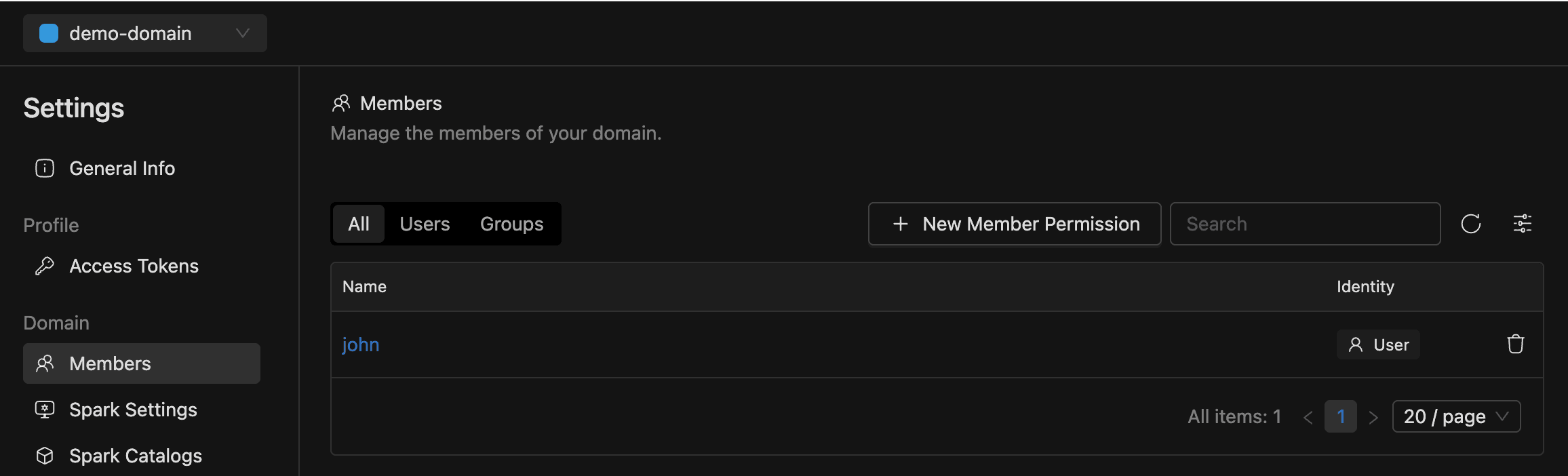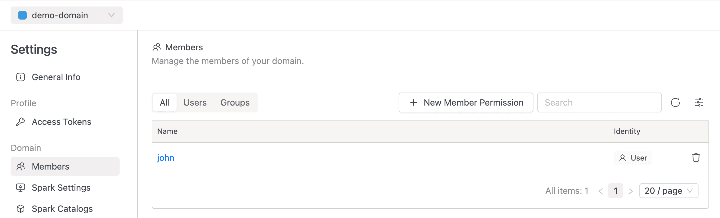 - Roles: assign domain-level roles to users as members.