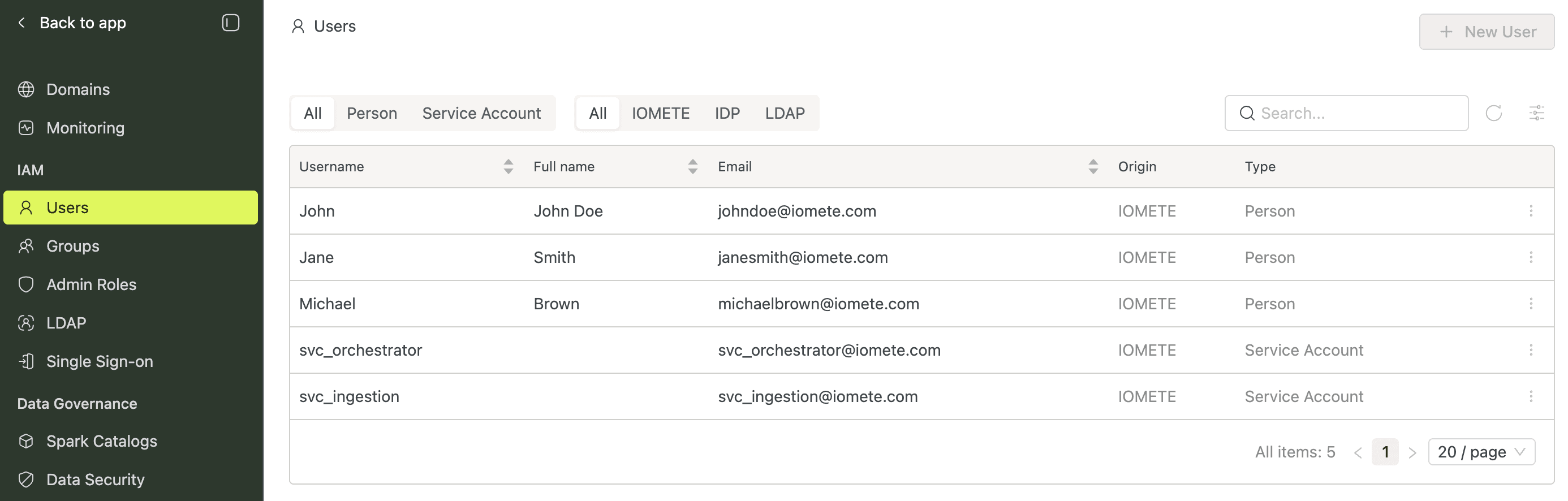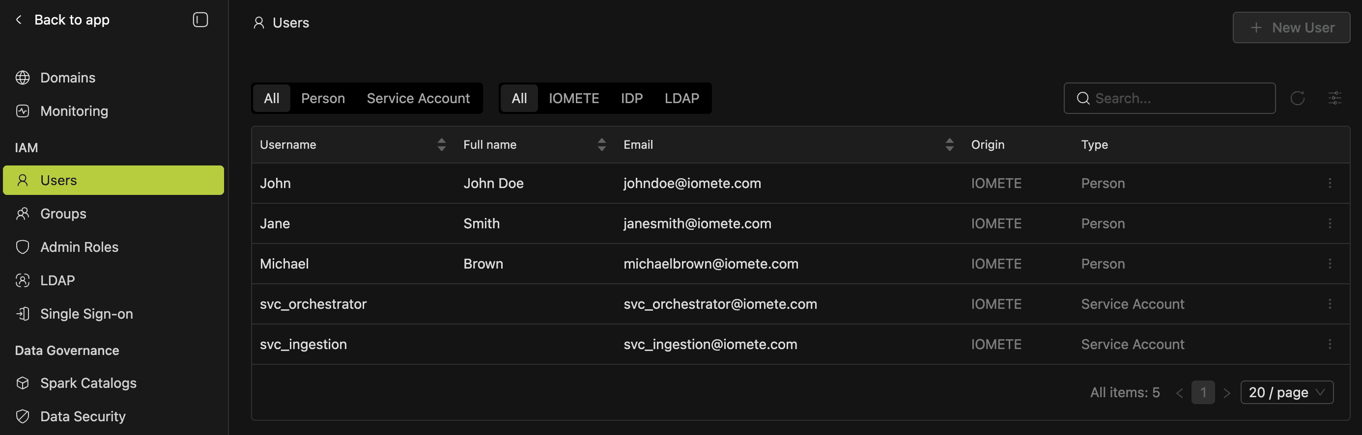 Every person or system that accesses the IOMETE data plane needs a user account. Each account has a type (Person or Service Account) and an origin that indicates how it was provisioned: IOMETE (local), LDAP (directory sync), or IDP (SAML/OIDC).