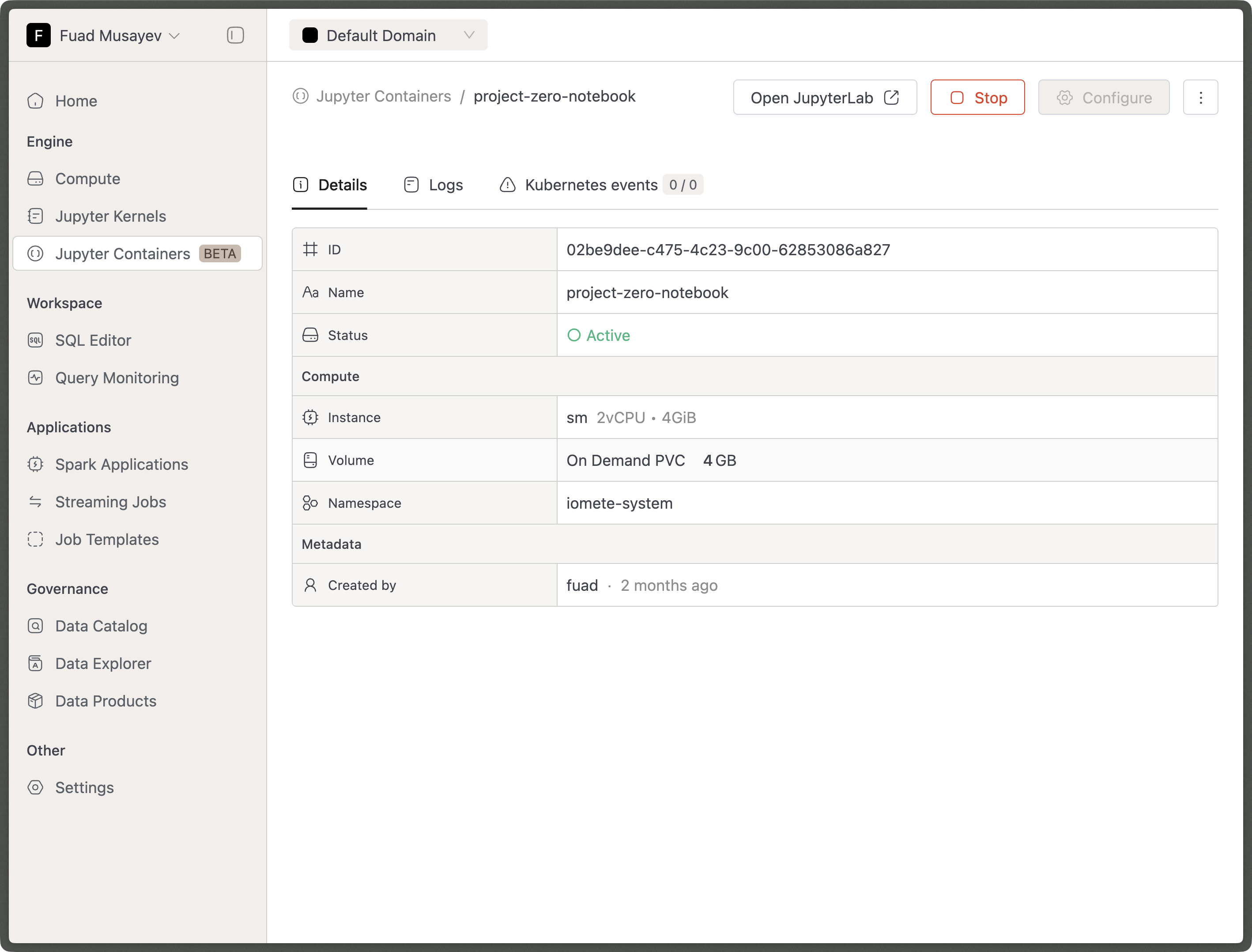 Jupyter Containers is a feature within the IOMETE Lakehouse Platform that enables users to deploy and manage JupyterLab instances as containerized workloads in Kubernetes. This solution provides on-demand, scalable data science environments with persistent storage and seamless integration with the broader IOMETE ecosystem.